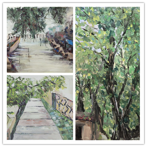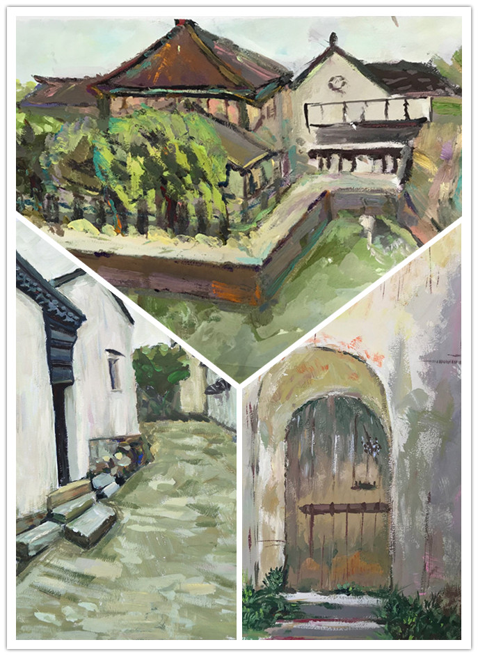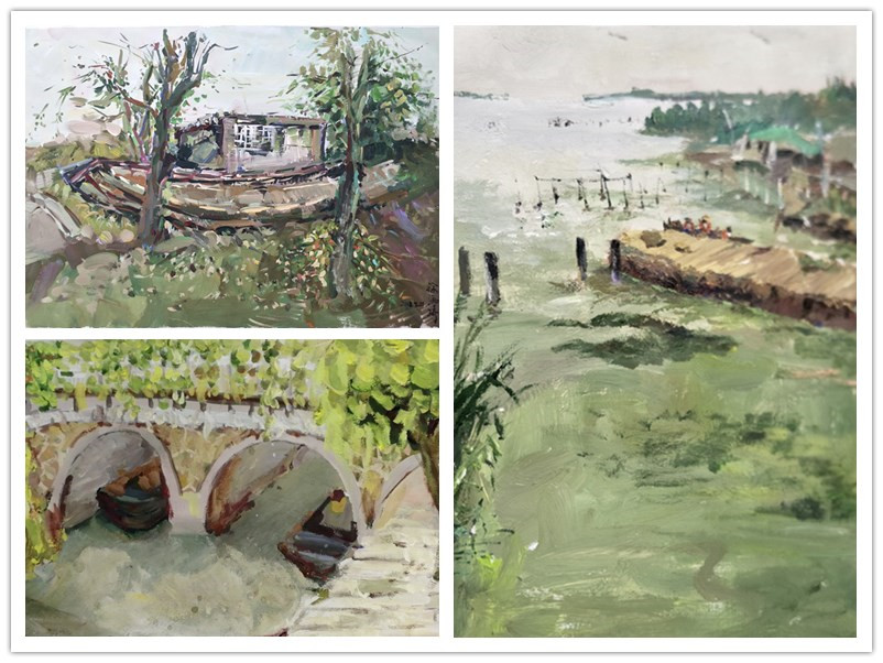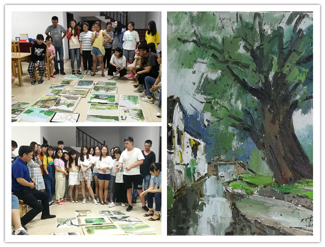 在两位老师的带领和每日的作业点评下,同学们通过切身观察和感受,对明月湾古村的建筑、古树等人文气息的了解,对太湖古码头的日升日落的直观感受。在对景写生中逐渐锻炼自己的独特观察视角和表现语言。在此期间美术教研室主任庆旭和黄玉兰、沈聪两位老师也到写生基地来看望指导学生。