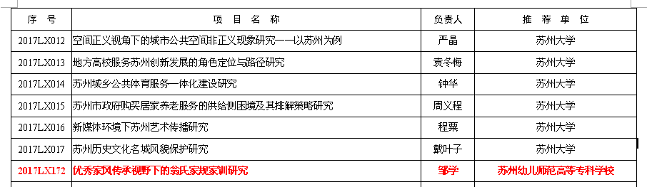 另:根据中共苏州市委宣传部、苏州市哲学社会科学界联合会5月17日联合下发的《关于公布2017年度苏州市社会科学基金项目立项项目的通知》(苏社科字〔2017〕号),邹学老师的《优秀家风传承视野下的翁氏家规家训研究》(2017LX172)也获批2017年度苏州市社会科学基金项目立项项目。
