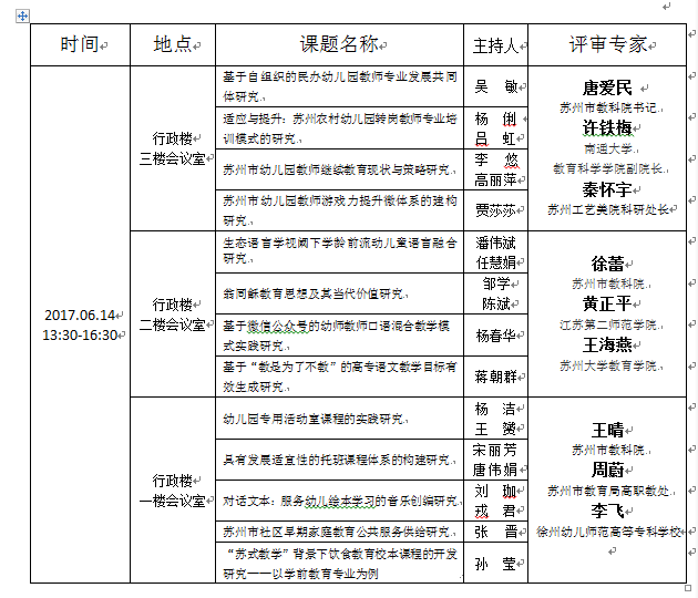 苏州市十三五规划立项课题开题 时间:2017-06-14 17:53:32 来源:本站原创 作者:科研处 浏览:次 分享到: 6月14日下午13:30,科研处组织召开了苏州市十三五规划立项课题开题活动,并非常荣幸地邀请到苏州市教科院、苏州市教育局高职教处、苏州大学、南通大学、江苏第二师范学院、徐州幼儿师范高等专科学校以及苏州工艺美院相关领导及教授、博士担任本次评审的专家,对我校及附属幼儿园吴敏、潘伟斌、宋丽芳、刘珈等13位老师课题进行立项论证,给予了宝贵的意见和建议。 打印正文 关闭本页