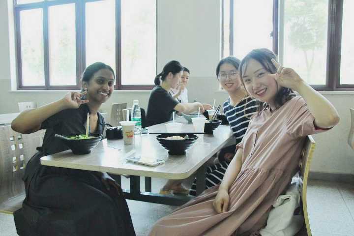 上午9:40,实习生团队到达我校并在艺术楼观摩了我校的技能课,分别有美术、钢琴、舞蹈和声乐。中午11:45,学前二系的16位学生代表接待了来访客人。学生代表们两人一组,一同接待外宾。首先,同学们带领外宾参观了我校食堂,带外宾们体验了用现金充值一卡通和排队买饭。外宾表示很喜欢我校食堂丰盛美味的饭菜,并且对我校学生良好的就餐秩序和礼仪赞不绝口。在聊天中,同学们了解到外宾们对钢琴很感兴趣。于是,苏幼之旅的第二站,外宾们选择了琴房。一进门,外宾们便被悠扬的琴声吸引了,露出赞赏的表情。闲谈中,我们了解到,乔治布朗学院没有琴法这门课程,她们十分羡慕我校学生可以学习钢琴并且每天与音乐相伴。接着,同学们带领外宾参观了学生宿舍。外宾们对六人间的格局表示十分惊讶,因为加拿大大多都是单人间或两人间。“6个姐妹一起住,总觉得会很温馨”,Hamsananthy这样说道。参观之余,二系174班的冷一凡同学为外宾们表演了舞蹈——扇子舞,获得了外宾的高度好评。最后,同学们带领外宾们参观了图书馆的绘本区,向她们展示了我校一系学生完成的英文绘本。下午1:30,来自乔治布朗学院的Kimberly Bezaire博士在合班教室B开展了小型讲座《Play Based Curriculum》(寓教于乐),学前二系部分同学参加了本次讲座,在积极愉快的气氛中,同学们对游戏课程有了新的认识。