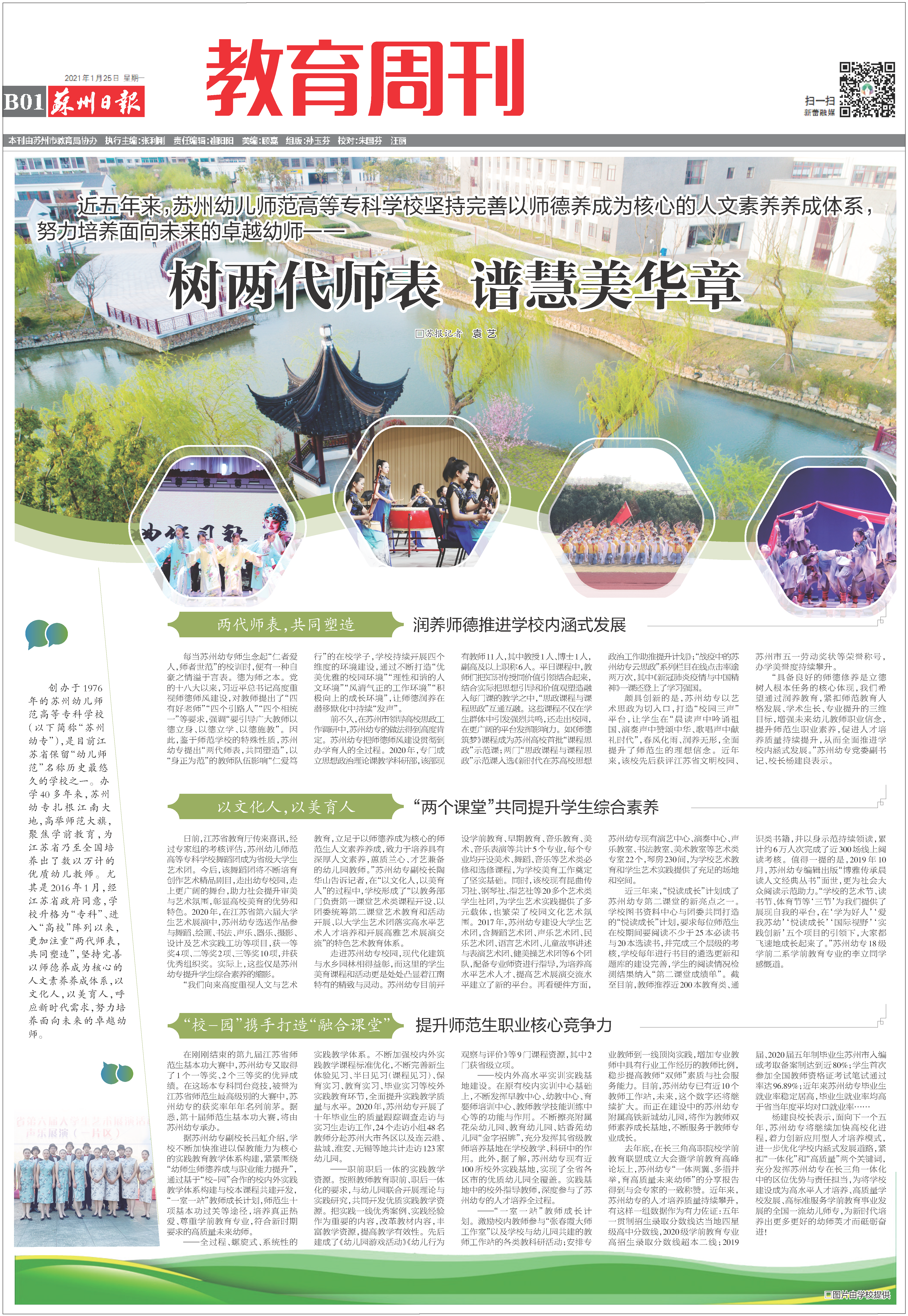 《苏州日报》整版报道苏州幼专:《树两代师表 谱慧美华章》 时间:2021-01-25 12:30:00 来源:苏州日报 作者:校办 浏览:次 分享到: 2021年1月25日,《苏州日报》B01版教育周刊栏目以《树两代师表 谱慧美华章》为题,整版报道了近五年来,苏州幼专坚持完善以师德养成为核心的人文素养养成体系,努力培养面向未来的卓越幼师。 打印正文 关闭本页
