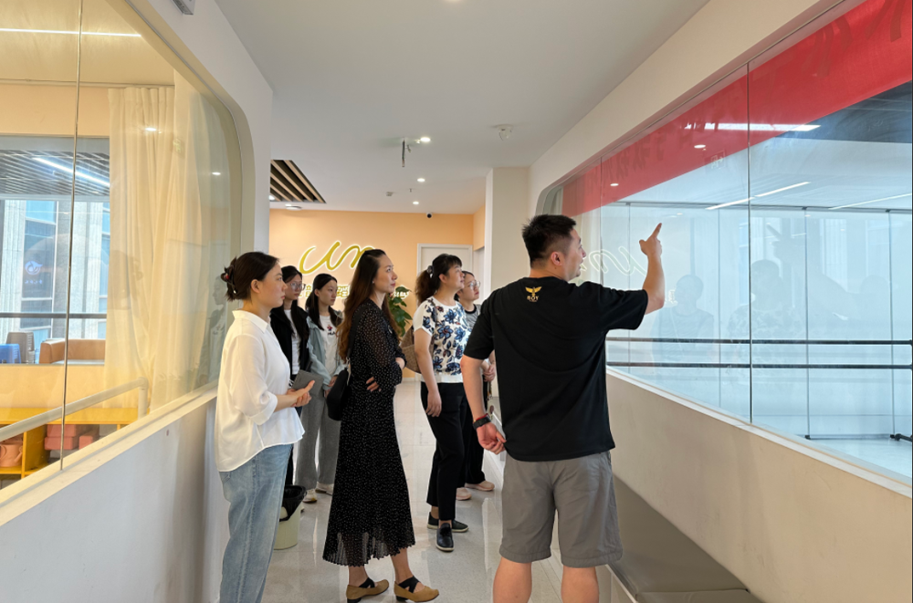 当天上午,调研组在中心负责人郁总的陪同下,参观了舞之韵舞蹈培训中心的各类舞蹈教室、排练厅及辅助功能室等硬件设施,详细了解了其课程体系、教学特色、师资配置与日常运营管理模式。作为南通地区具有较高知名度和影响力的艺术教育机构,舞之韵在少儿及青少年舞蹈教育领域积累了丰富经验,形成了较为成熟的教学体系。