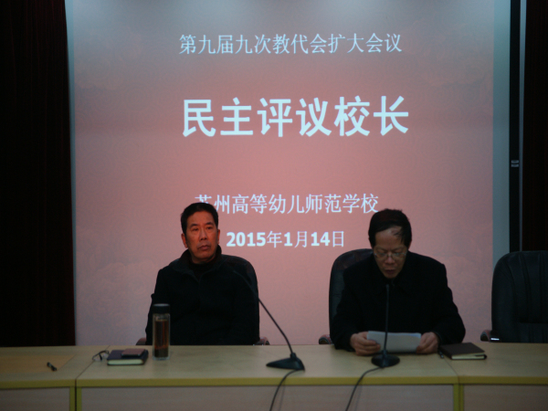 2015年1月7日,我校第九届九次教代会扩大会议在校本部102报告厅召开。大会应到代表52人,实到代表50人,列席代表43人,特邀代表3人。大会分别听取了孔宝刚校长、潘建中书记2014年度述职述廉述学报告,对孔宝刚校长的述职述廉述学报告进行了分组讨论和评议,并以投票的形式对五位校级领导进行了民主测评。