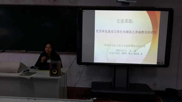 我校党委举行党建微课题成果交流会 时间:2014-10-27 00:00:00 浏览:次 分享到: 10月22日下午,我校党委举行党建微课题成果交流会。四个支部分别就《党课建设的对策机制研究》、《明方向,提质量,探索入党积极分子公推优选机制》、《学校党建参与新教师专业成长的作用机制研究》、《党员率先落实日常行为规范之养成教育的研究》等四个课题的研究成果进行大会交流。四个党建微课题,围绕我校党建工作中遇到的热点问题进行深入研究,显现出课题新、过程实、成果管用的良好效果,有些课题的研究成果以论文的形式显现出来并发表在省级刊物上。微课题的研究有力地推进我校党建工作的科学化水平。 打印正文 关闭本页