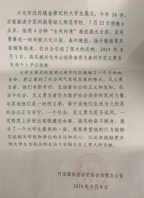 泰州一女孩溺水 大学生把握黄金4分钟营救成功