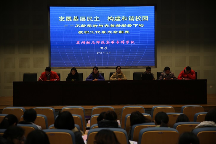 我校第十届教职工代表大会第一次会议,在上级领导的关怀下,经过全体代表的共同努力,圆满完成了预定的各项任务。希望每一位代表能够一如既往地行使自己的权利,履行自己的义务,服务、团结、带动广大教职员工,共同创造苏州幼专新的辉煌!本次教代会在《国际歌》中胜利闭幕。