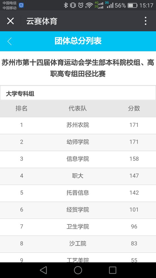 2016年,10月21日22日,我校田径队参加了苏州市第十四届体育运动会高职高专组田径比赛。连绵两天的大雨能够影响场地的条件,却浇不灭运动员们拼搏的热情。在不停倾泻的大雨之下,在运动员们的顽强斗志和不懈努力下,我校最终斩获总分171分,取得了团体总分并列第一,团体排名第二的好成绩。苏幼田径队市运会再创佳绩!