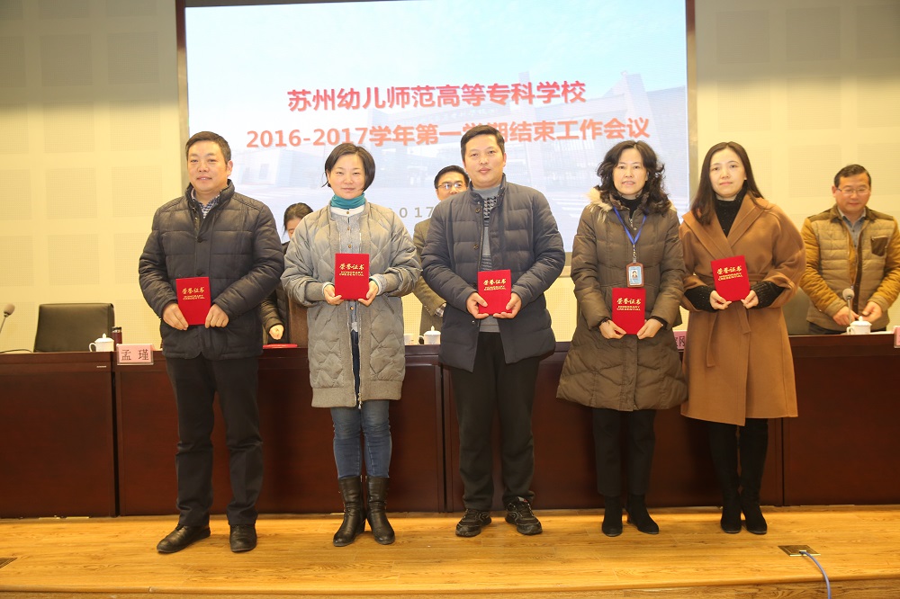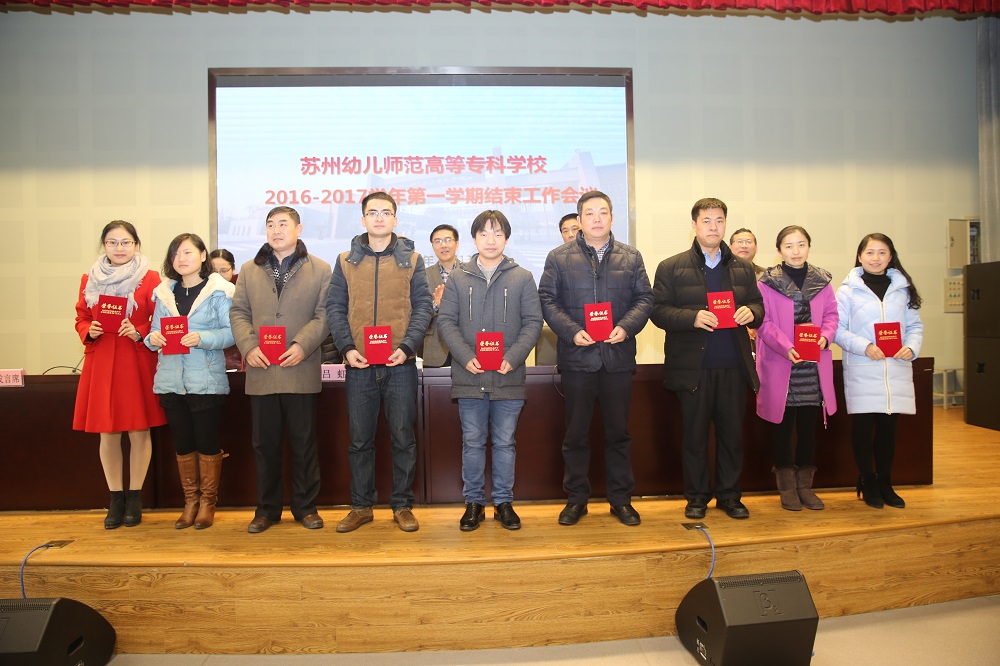 会议共有五项内容:第一项内容是给我校在年度争先创优活动中获奖的老师和先进集体颁奖;第二项内容是给我校首届科研成果奖、教学成果奖获奖老师颁奖;第三项内容是处室与教师代表发言:处室代表学前1系主任滕飞、学工处处长肖蕾,教师代表贾莎莎、郭进萍老师;第四项内容是副校长孔宝刚对我校2016年度进行总结,并提出发展思考;第五项内容是校长杨建良做最后总结,杨校长为贯彻落实好全国高校思想政治工作会议精神,对我校2017年思想政治工作进行了部署,随后,杨校长提出了“统一思想、齐心协力,规范管理、夯实基础,改革创新,提升内涵” 三点建议与全体教工共勉。
