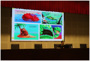 陈建华老师结合《幼儿园规程》《幼儿园教育指导纲要》《3-6岁儿童学习与发展指南》明确“语言是交流和思维的工具”,通过“幼儿语言的发展”展示一个新的优化语言教学的视角——艺术渗透。随后,陈老师以“要点、断点、支点”为关键词,以《床底下》《一本没有人打开的书》《石头汤》三本绘本为例,带领同学们深刻体会了艺术渗透教育活动开展中的重点“研读与审议”。之后,陈老师又展示了《我不想生气》《老驴过生日》等十本绘本,配合着恰切的音乐和陈老师生动的讲说,同学们更好地理解了陈老师提出的“艺术渗透教育中活动的设计与开展”中的“情绪的相通”“艺术的感受”等十个重点。最后,陈老师现场回答了三位同学提出的依托绘本进行艺术渗透教育的相关问题,精彩的回答赢得了阵阵掌声。