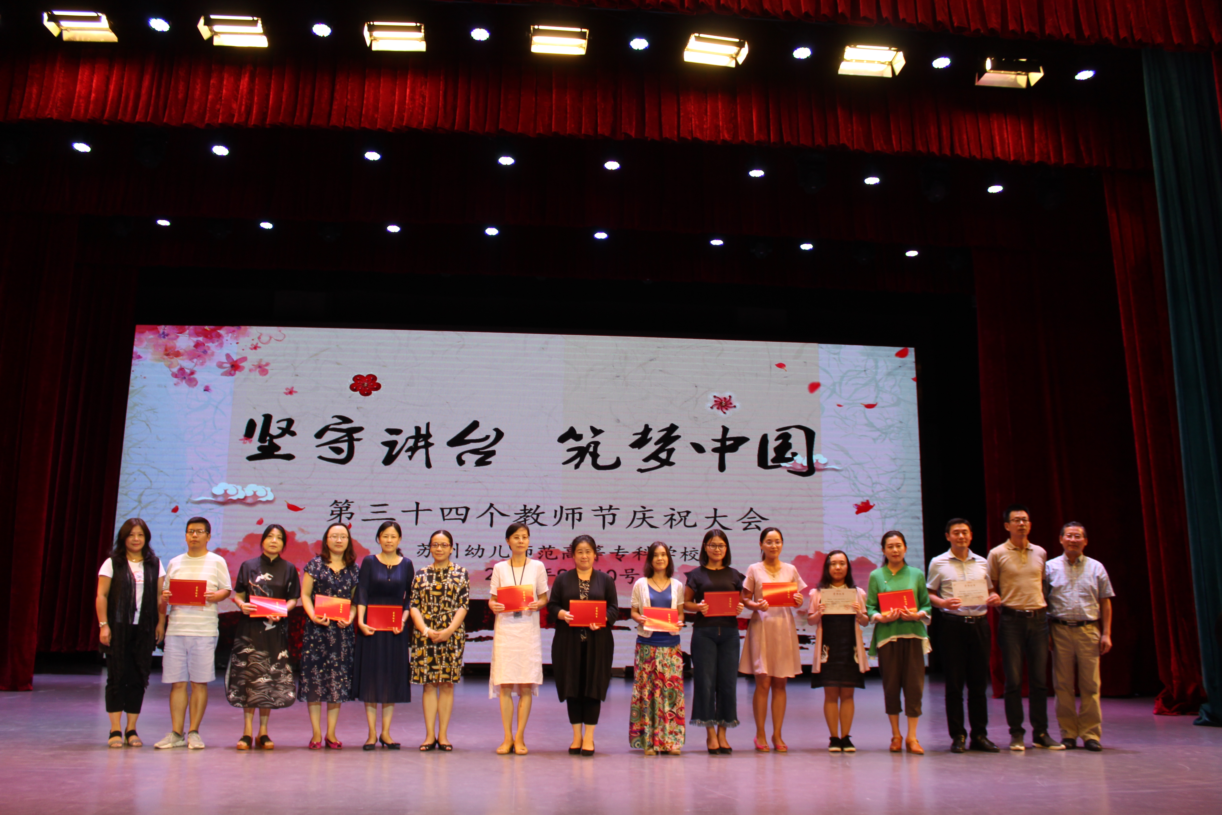庆祝大会主要分为教师表彰和庆祝表演两个部分。大会在新教师入职仪式及师徒结对仪式的庄严氛围中开始,并由新教师代表林艳娟和导师代表顾红作精彩发言。在教师表彰环节,学校领导先后为2017—2018学年“一对一”爱生帮教活动先进个人、2017—2018学年优秀班主任以及从事教育工作满30年的老教师颁发荣誉证书。随后,学生代表冯宇楠、优秀教师代表张媛媛、从事教育工作满30年教师代表刘黎莉和退休教师代表盘海鹰分别发言,她们从各自角度分享了对教师身份和角色的理解和热爱。最后,杨建良校长讲话,首先向全校教职工致以节日的祝贺和最诚挚的问候,接着他明确了新时代赋予教师的新的使命与荣耀、介绍了我校师资队伍的建设情况、分享了学校发展取得的可喜成绩,并对大家提出殷切希望,希望大家加强师德修养,树立良好教师形象;积极转变教育观念,加强教育教学改革;不断提高教育质量,努力创建品牌幼专。
