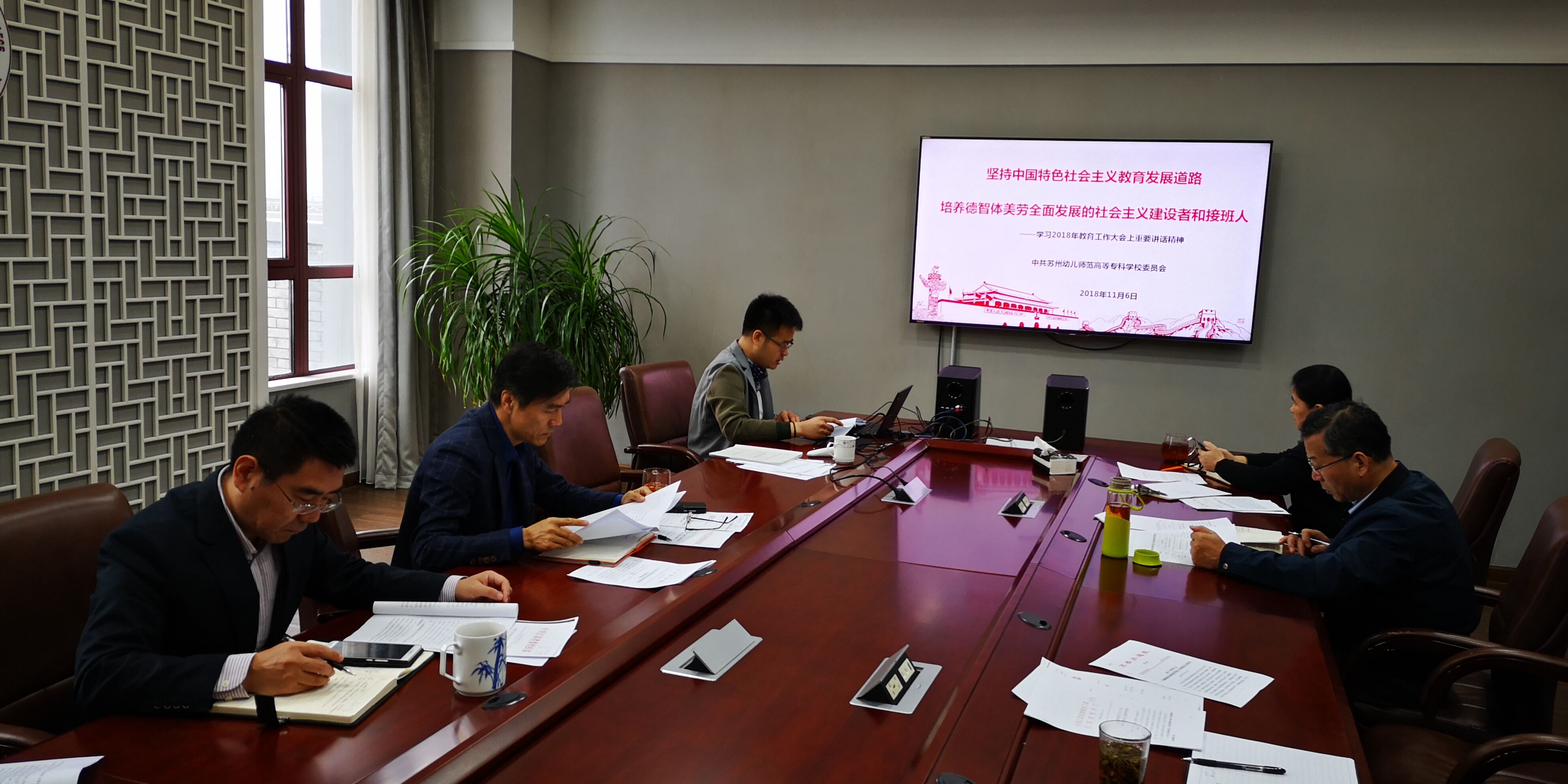 会议首先由杨建良校长传达了《省委教育工委省教育厅关于认真学习贯彻全国教育大会精神的通知》(苏委教﹝2018〕11号)精神。接着,组织人事处副处长潘伟斌带领大家一同学习全国教育大会精神,从前言导读、全国教育大会基本情况、习近平总书记讲话要点、李克强总理讲话要点、全国教育大会20大金句和学习贯彻大会精神等六个部分展开讲解、学习。