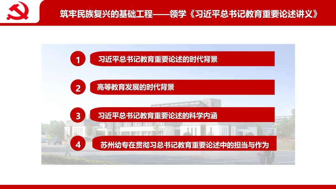 杨校长从“习近平总书记教育重要论述的时代背景”“高等教育发展的时代背景”“习近平总书记教育重要论述的科学内涵”“苏州幼专在贯彻习总书记教育重要论述中的担当与作为”四个方面进行了领学。