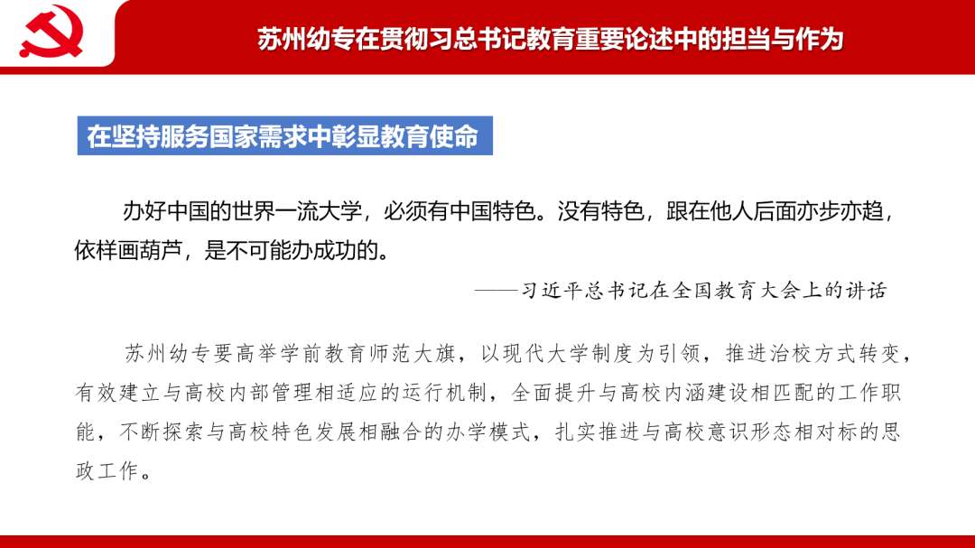 最后,杨校长结合学校实际,提出苏州幼专在贯彻习总书记教育重要论述中的担当与作为。杨校长指出,苏州幼专要高举学前教育师范大旗,以现代大学制度为引领,推进治校方式转变,有效建立与高校内部管理相适应的运行机制,全面提升与高校内涵建设相匹配的工作职能,不断探索与高校特色发展相融合的办学模式,扎实推进与高校意识形态相对标的思政工作。学校要深刻意识到人民群众对优质的学前教育资源的迫切需求,及学前教育本科化趋势挑战的日益临近,积极开展协同育人,将社会资源转化为育人资源;为经济发展提供强大创新动力,深化产教融合,促进教育链、人才链与产业链、创新链有机衔接。