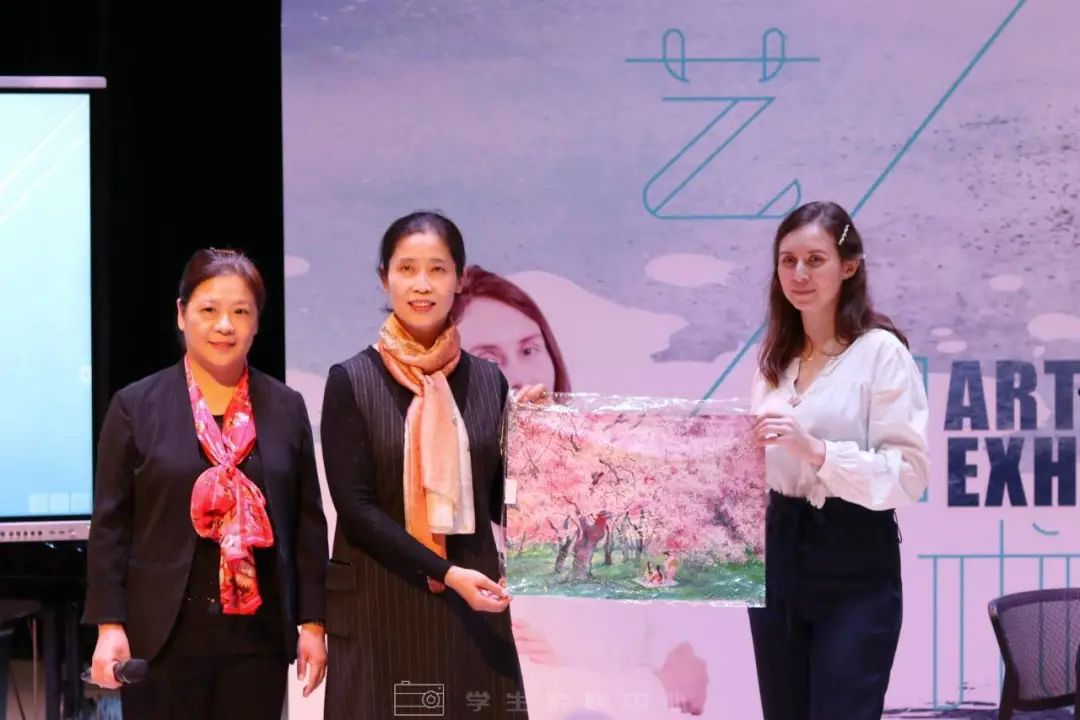 参观结束后,尤利娅博士和马瀚翔先生在演奏厅,与我校艺术系师生开展了一次别开生面的讲座交流。艺术系主任王婉青接受尤利娅博士赠画,尤利娅博士与学生代表华雯艳同学访谈。