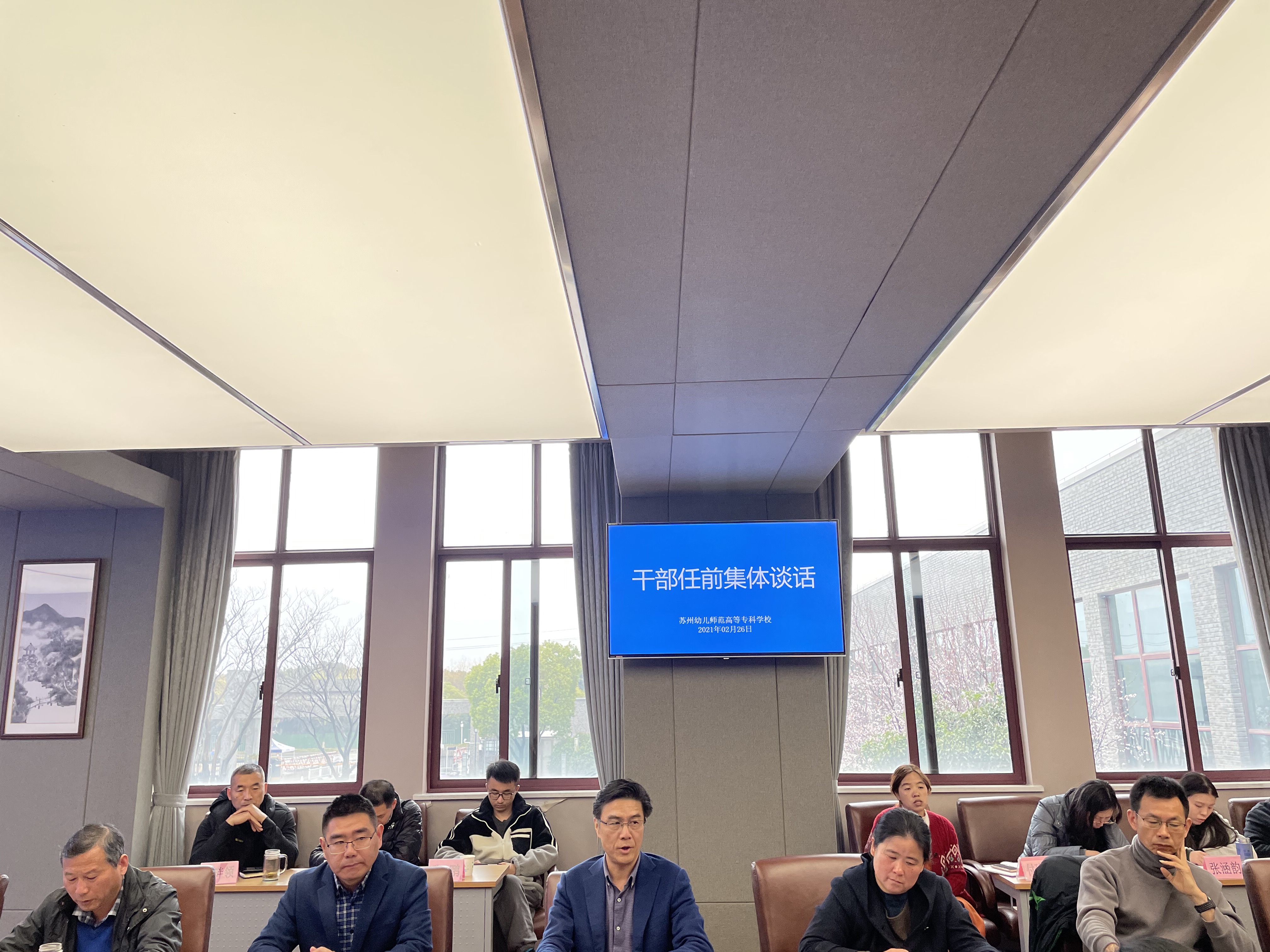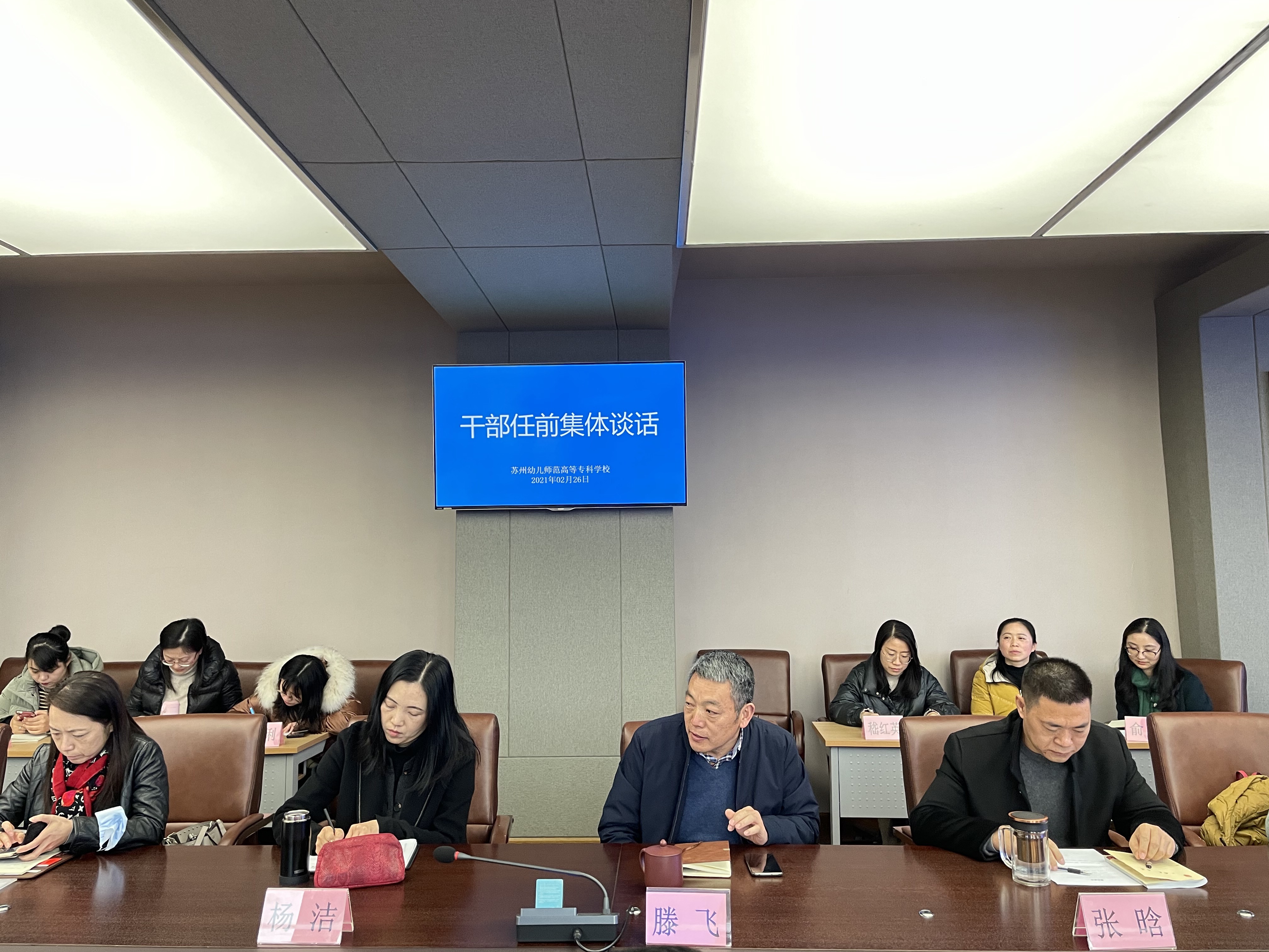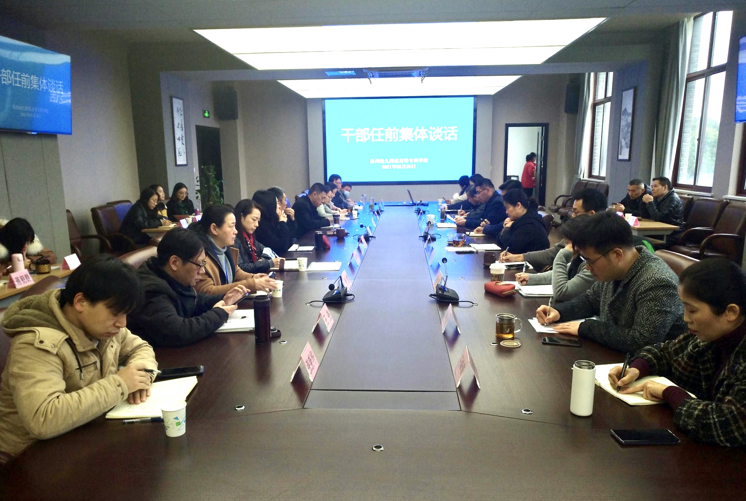 为促进干部担当作为,加强干部教育和党内监督,增强干部依法履职和廉洁自律意识,2月26日上午九点,我校在照怀楼第二会议室举行中层干部任前集体谈话。杨建良校长、吕虹副校长、陶华山副校长,师范部全体中层干部、三所附属幼儿园园长参加会议,会议由吕虹副校长主持。