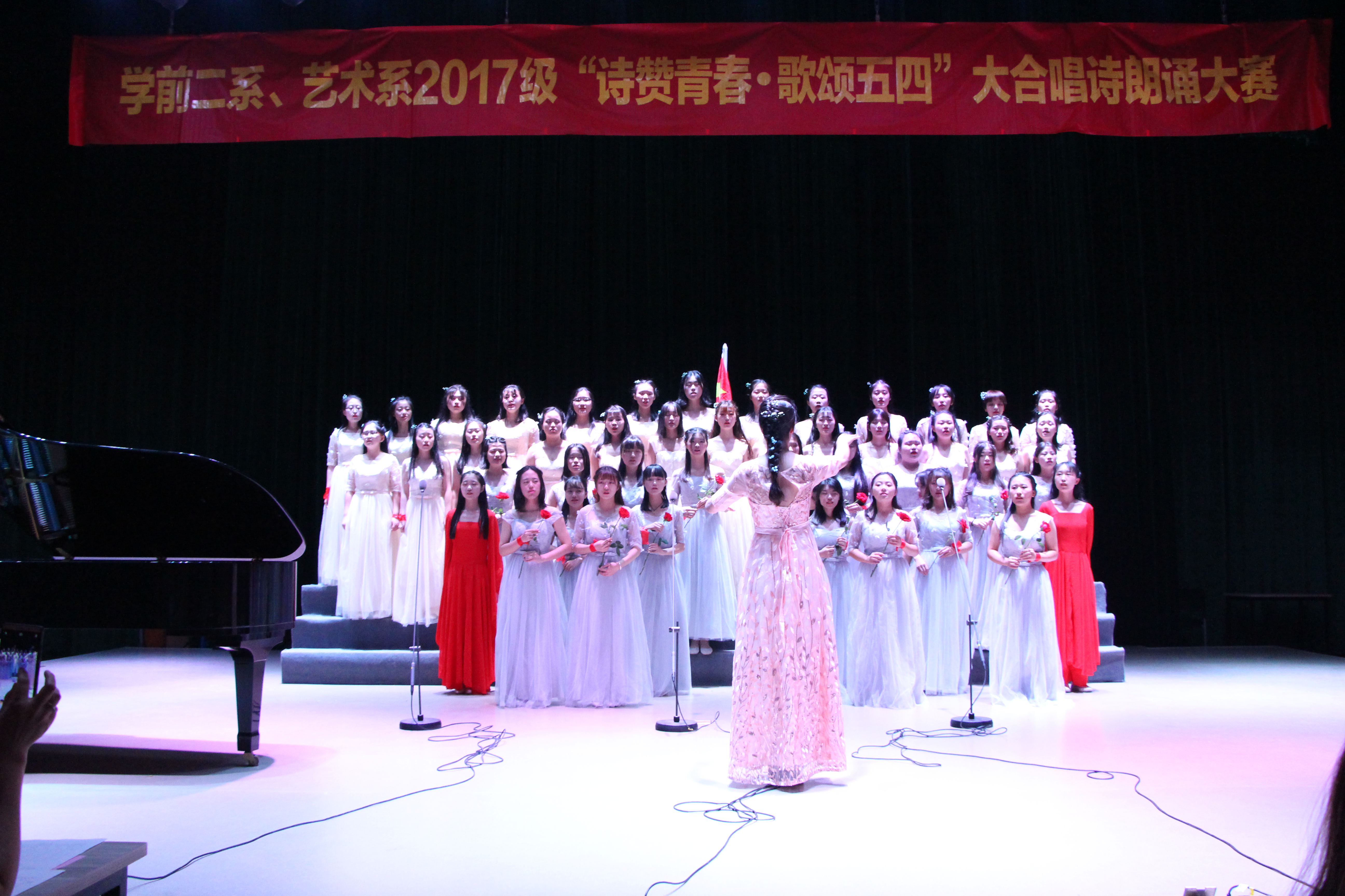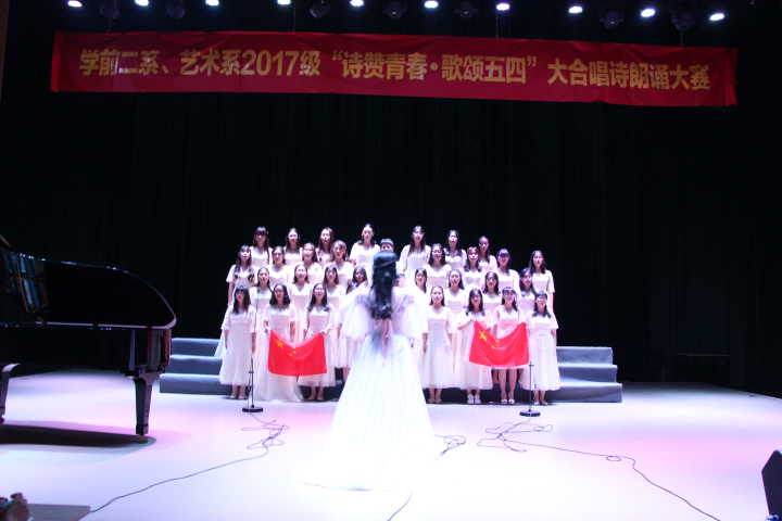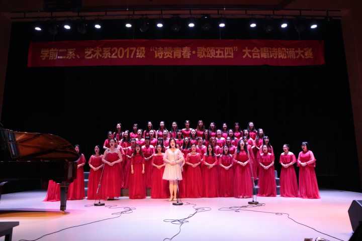 为了纪念五四运动,弘扬五四精神,5月17日,我校学前二系艺术系17级在演奏厅举行了以“诗赞青春·歌颂五四”为主题的大合唱朗诵比赛。二系蒋朝群、刘若诗、倪莹老师。艺术系王婉青主任、曹静、高鑫、谢慧娟等老师作为评委出席了本次比赛。