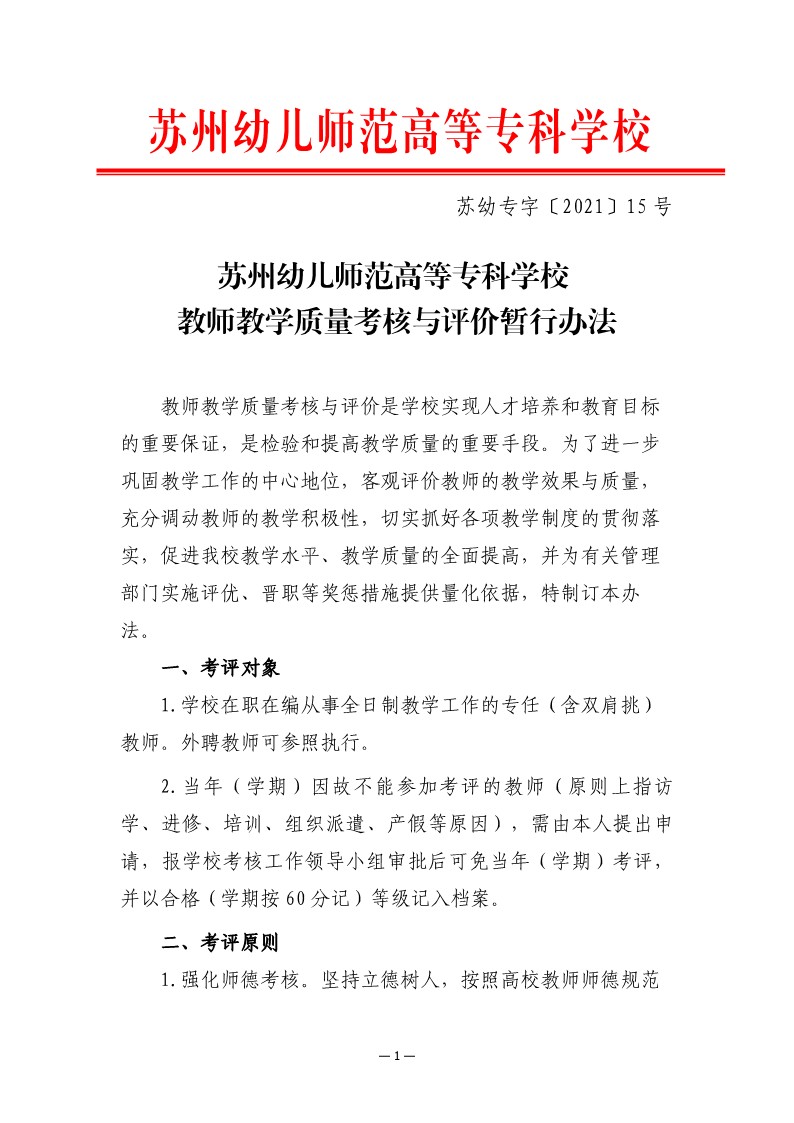 苏幼专字〔2021〕15号:买球赛的app官网教师教学质量考核暂行办法(5.10) 来源:转发 发布时间:2021-05-24 17:50:38 浏览次数: 次 【字体:小 大】 分享到: 【打印正文】