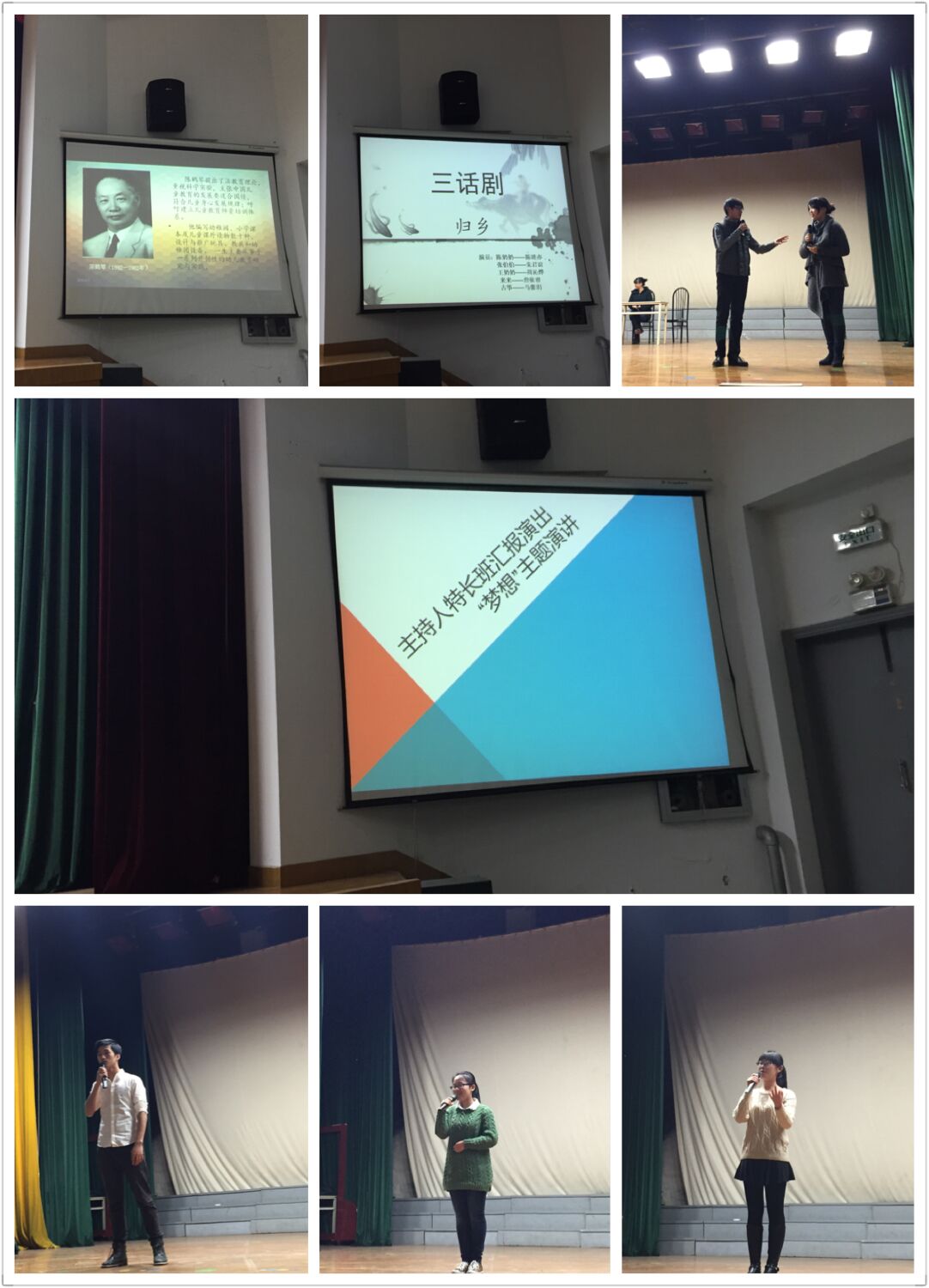 同时,在此次专场演出中,同学们还观看了励志视频“预见,方能遇见”,深刻感受到了“梦想”在人类历史进程中的巨大推动作用。在演讲的最后,四位演讲者还大家提出了进一步的期望,希望同学们在日后能坚持自己的“幼师梦”,成为一名优秀的幼师生。演讲之后的三话剧《归乡》,同样受到了同学们的喜爱。此剧系苏州市第六届三话比赛获奖作品。