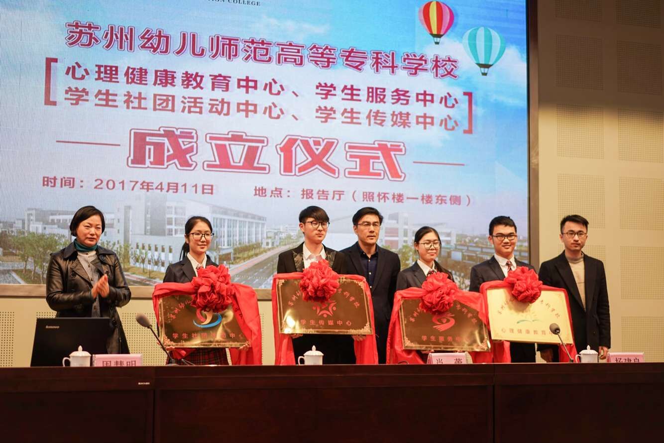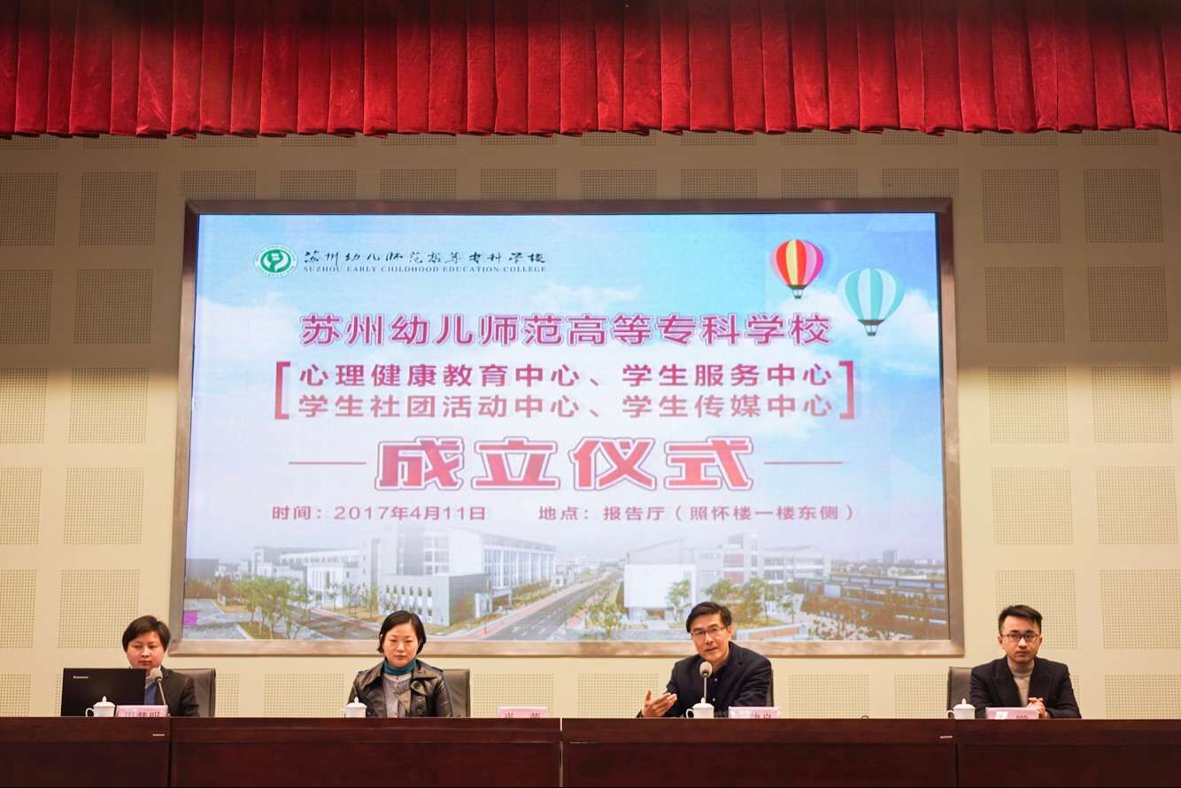 2017年4月11日中午,我校心理健康教育中心和学生服务中心、学生社团活动中心、学生传媒中心三个学生中心的成立仪式在校报告厅举行。校长杨建良、学工处处长肖蕾、学工处副处长张鹏、团委书记周慧明出席了仪式,全体班主任以及各系学生代表参加了成立仪式。仪式由周慧明主持。仪式分为学生工作报告、各中心介绍、授牌和领导讲话四项流程。