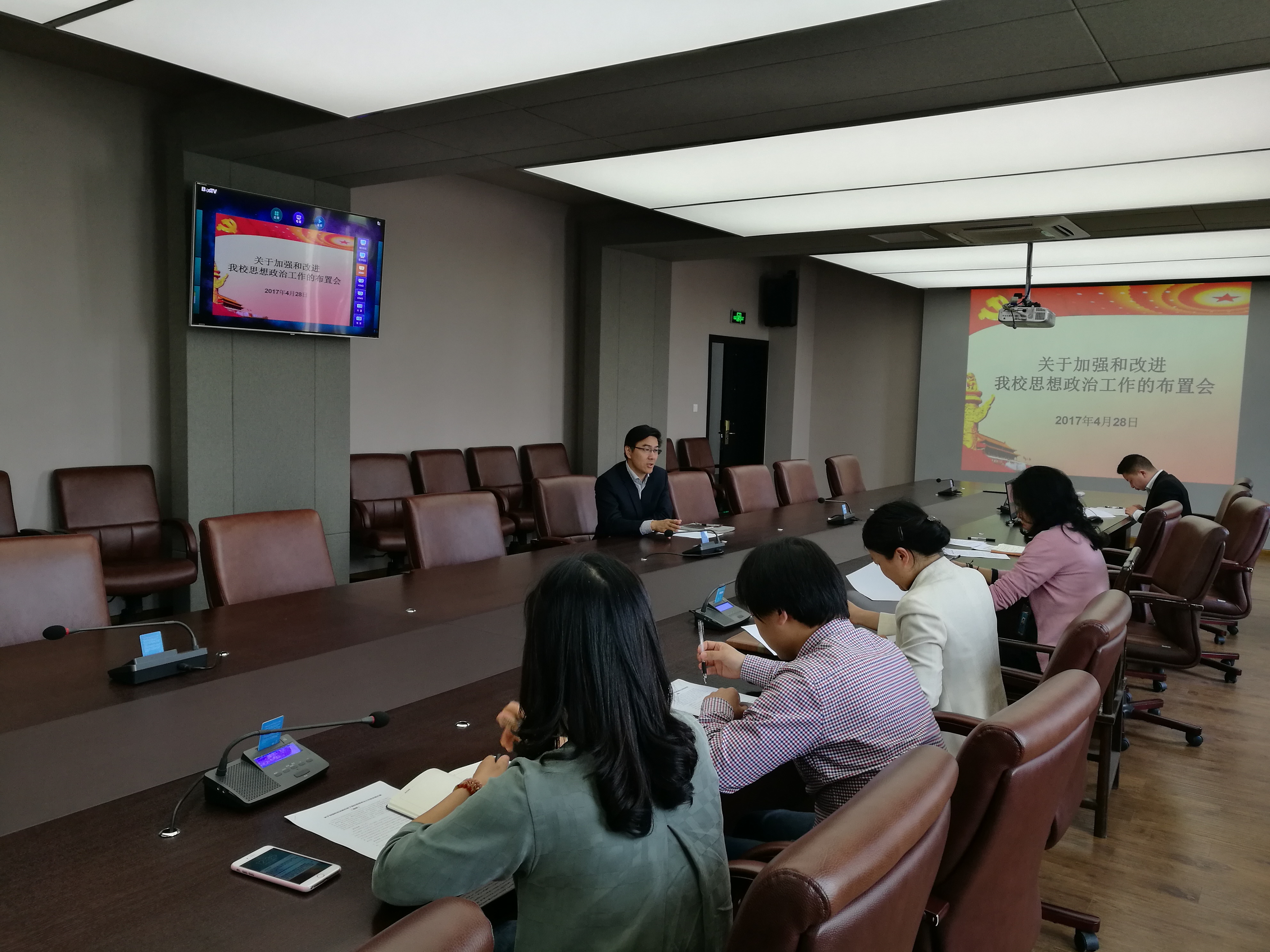 全国高校思想政治工作会召开后,学校高度重视会议精神和习近平总书记重要讲话精神的学习宣传。2017年3月以来,学校多次要求相关部门学习会议精神,为全面贯彻落实会议精神营造了良好的舆论氛围。 4月28日,召开了关于加强和改进我校思想政治工作的布置会。校长室、办公室、组织监察处、学工处、教师发展中心、教务处、校工会、校团委等主要部门负责人参加了本次会议,会议就实施起草我校的思想政治工作的实施方案做了相关部署。学工处肖蕾处长就全国高校思想政治工作会议要点、高校思想政治教育内容和理论框架做了解读。与会人员围绕如何把思想政治工作贯穿教育教学全过程,加强思想政治理论课建设,充分发挥思政队伍在学生思想政治教育工作中的重要作用,如何加强基层党建,将思想政治教育落实于第二课堂育人全过程等方面,展开了交流。