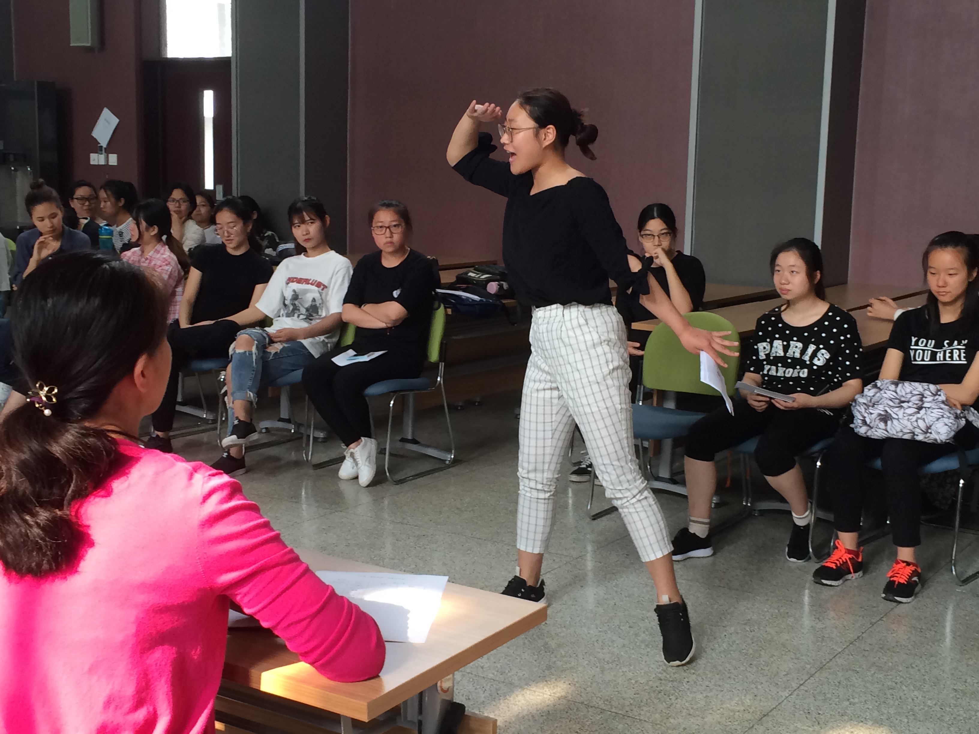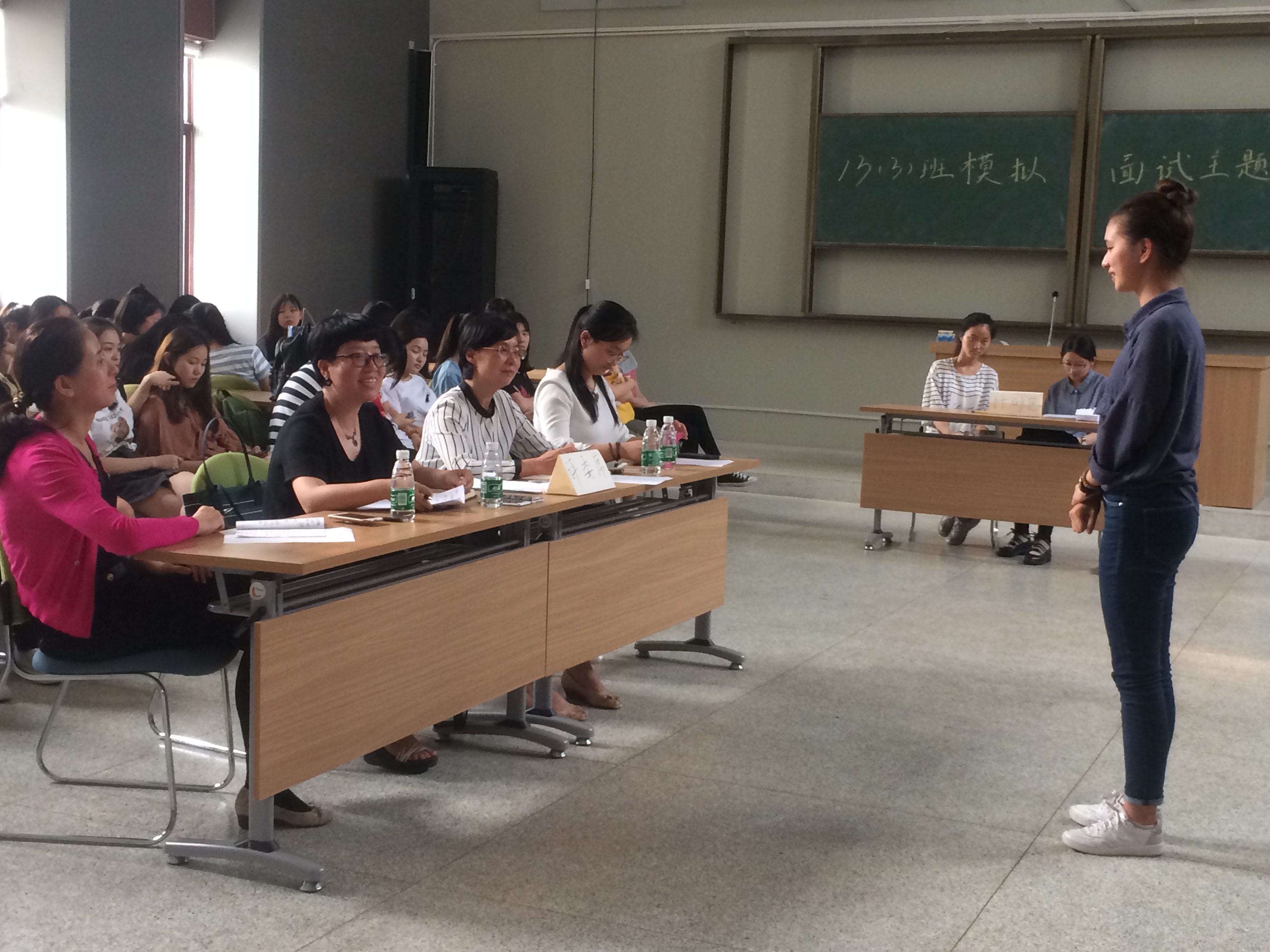 67日下午1530133班全体师生在我校合班教室C举行了一次别开生面的主题班会——模拟面试。近几年专门负责面试、招聘辅导工作的新区惠丰幼儿园范园长、曾任幼儿园园长的顾旅明老师、专业课教师贾莎莎老师和兰燕老师担任本次面试活动的评委,153班与159班的部分同学观摩了本次班会活动。