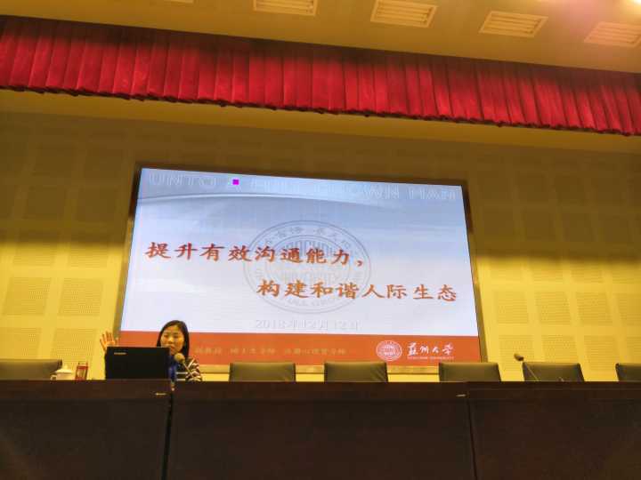 为了让同学们更好地人际交往,了解社会,认识自己,12月12日下午学工处有幸邀请到苏州大学教育学院副教授、硕士生导师王平博士为我校开展了一场专题为——提升有效沟通能力,构建和谐人际生态的精彩讲座。