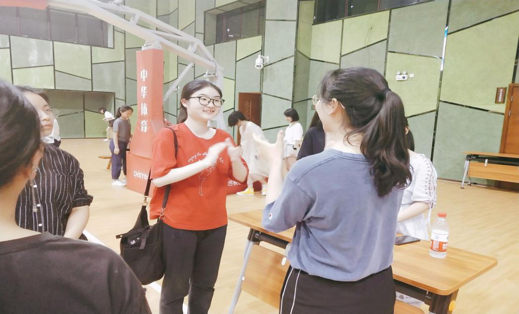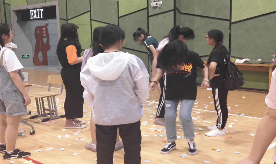 接下来我们看到的是“你说我猜”游戏,参与的同学分成两人一组,首先给第一个人一个成语,成语里带着某一种毒品里的一个字,第一名同学通过肢体动作来表达给第二名同学,第二名同学需要猜出该成语,限时60秒。比赛中,同学们绞尽脑汁,利用肢体比划动作,她们的动作各式各样,十分有趣。