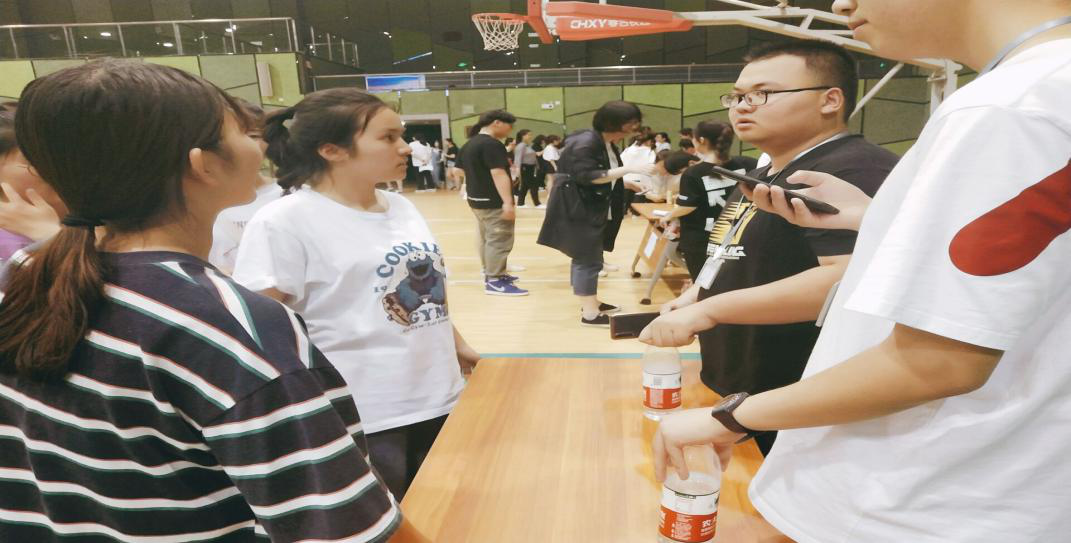 随之而来我们听到一阵阵加油声,原来是“握手言和”游戏,游戏规则为游戏需要现场组队,两人一组进行。游戏需要现场组队,两人一组进行。两个参与者面对面,左手向上,右手向下,主持人会随机读一段文字,当听到所读文字中有“毒”字时,就要握住右边同学的左手,同时自己要躲避左边同学握自己的左手。每个人只握住右边同学的左手,同时自己要躲避左边同学握自己的左手。每个人只能握自己右边的人,左手只可以躲,不能反握。如果主持人所读文字中没能握自己右边的人,左手只可以躲,不能反握。如果主持人所读文字中没有“毒”字就去握自己右边的同学,也被淘汰。根据完成情况获得相应数根据完成情况获得相应数量的奖品兑换券。看着同学们个个神经紧绷的样子,让我们都替她们捏了把汗。一旁的同学们也在奋力的喊着加油!祝愿她们在游戏中取得好成绩!