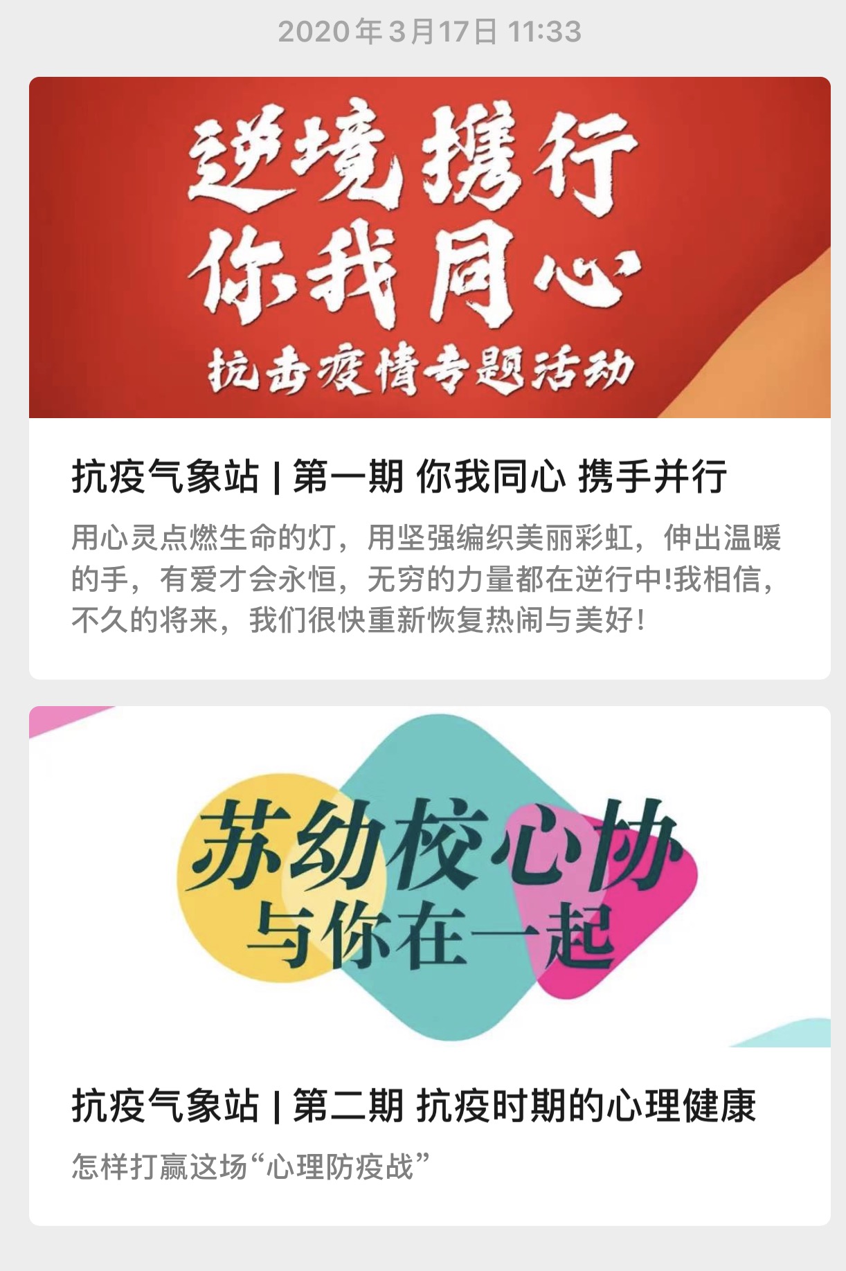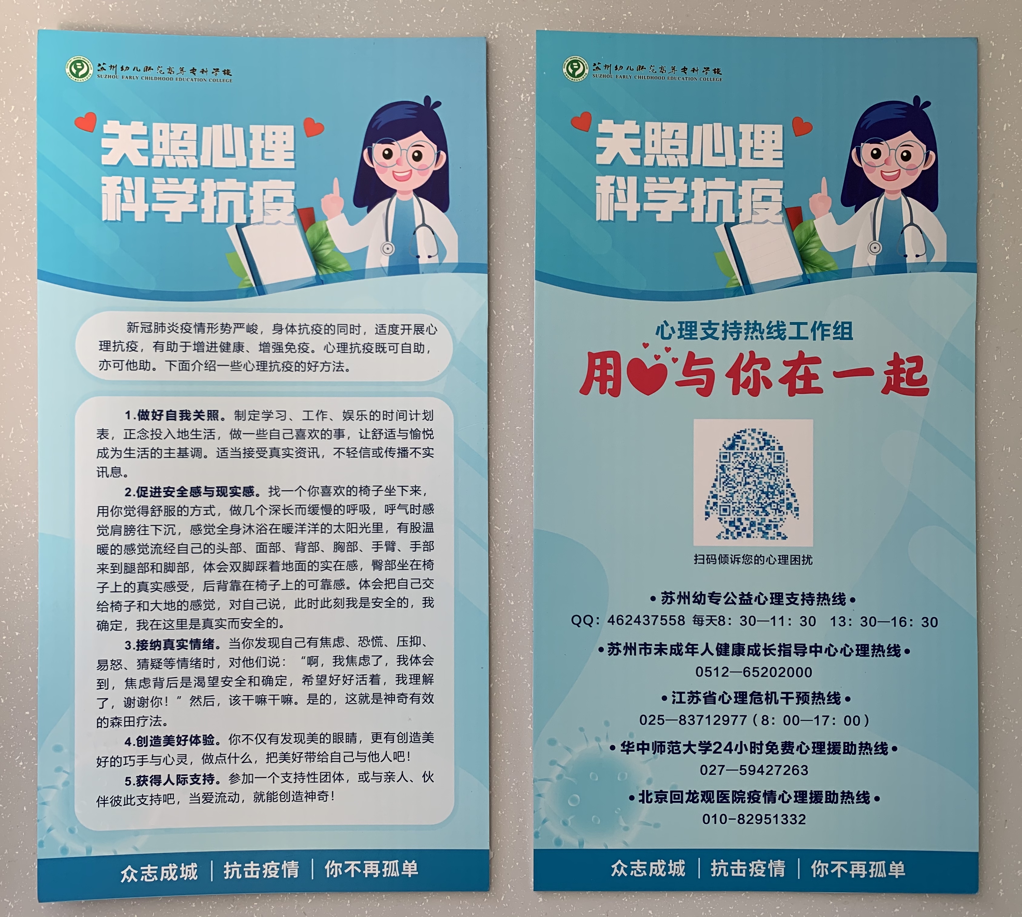 学校通过海报、微信公众号、班主任访谈等途径对心理支持工作进行了宣传。苏幼青年微信公众号推送了心理支持热线开通信息和江苏省心理援助热线等相关心理援助热线信息;苏幼心协微信公众号推送了以“逆境携行、你我同心”为主题的抗疫气象站专题文章三篇,开学前后推送了《疫情后如何做好开学心理准备》心理健康小视频。