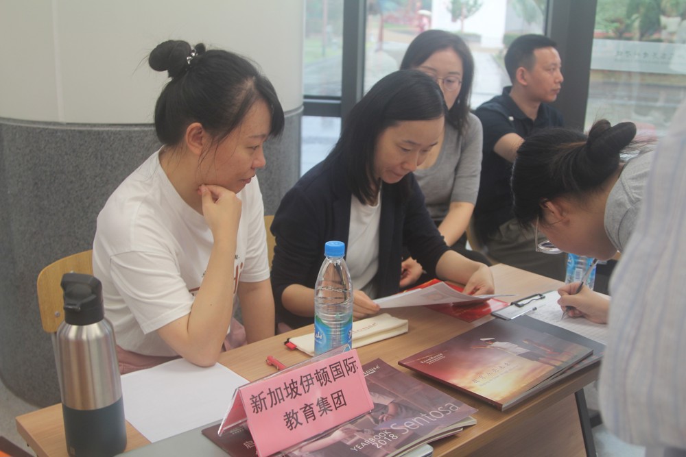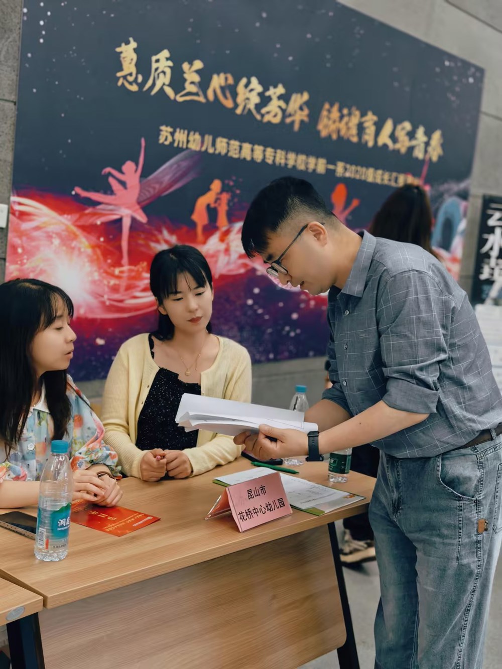 各用人单位负责人早早来到现场布置展位,耐心为毕业生讲解岗位需求和薪资待遇。昆山花桥中心幼儿园表示今年可能要引进超过10位幼儿园老师,吸引了很多毕业生投递简历。瑞思英语培训机构现场对真心想加入的同学进行了小小的面试。东方爱婴机构表示欢迎更多的吴江籍同学加入公司。宏景科技和两只老虎两家单位招聘编程乐高老师,吸引了很多男生前往咨询。